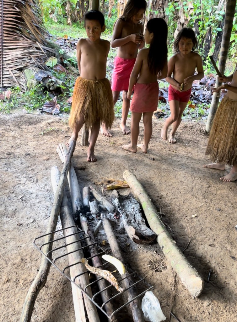 After the friendship dance, we were invited to the other thatched huts, where other children and their parents showed us how they cook fish and bananas over hot embers. They also sold jewelry and various wares, including piranha jaws and toucan bills on necklaces.